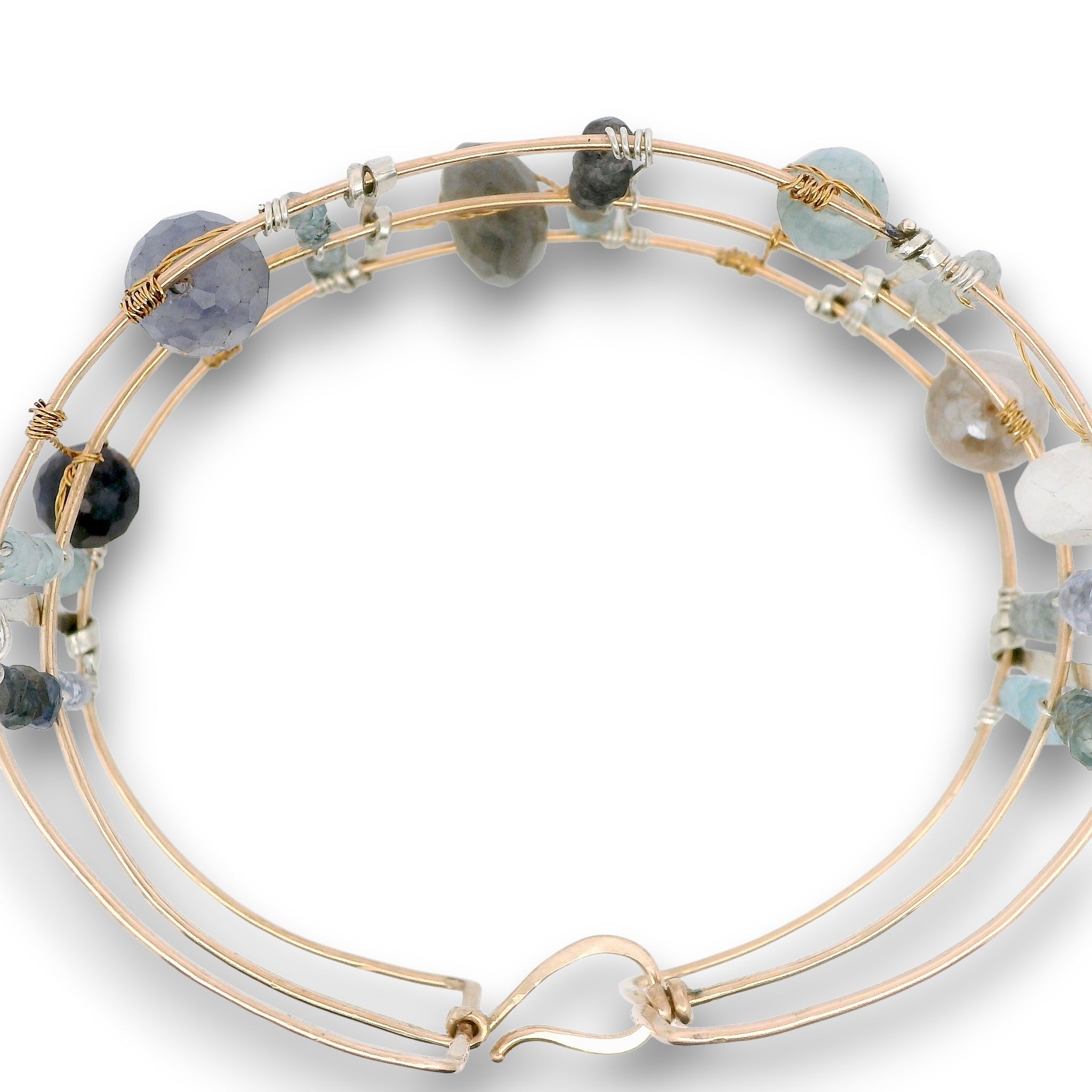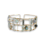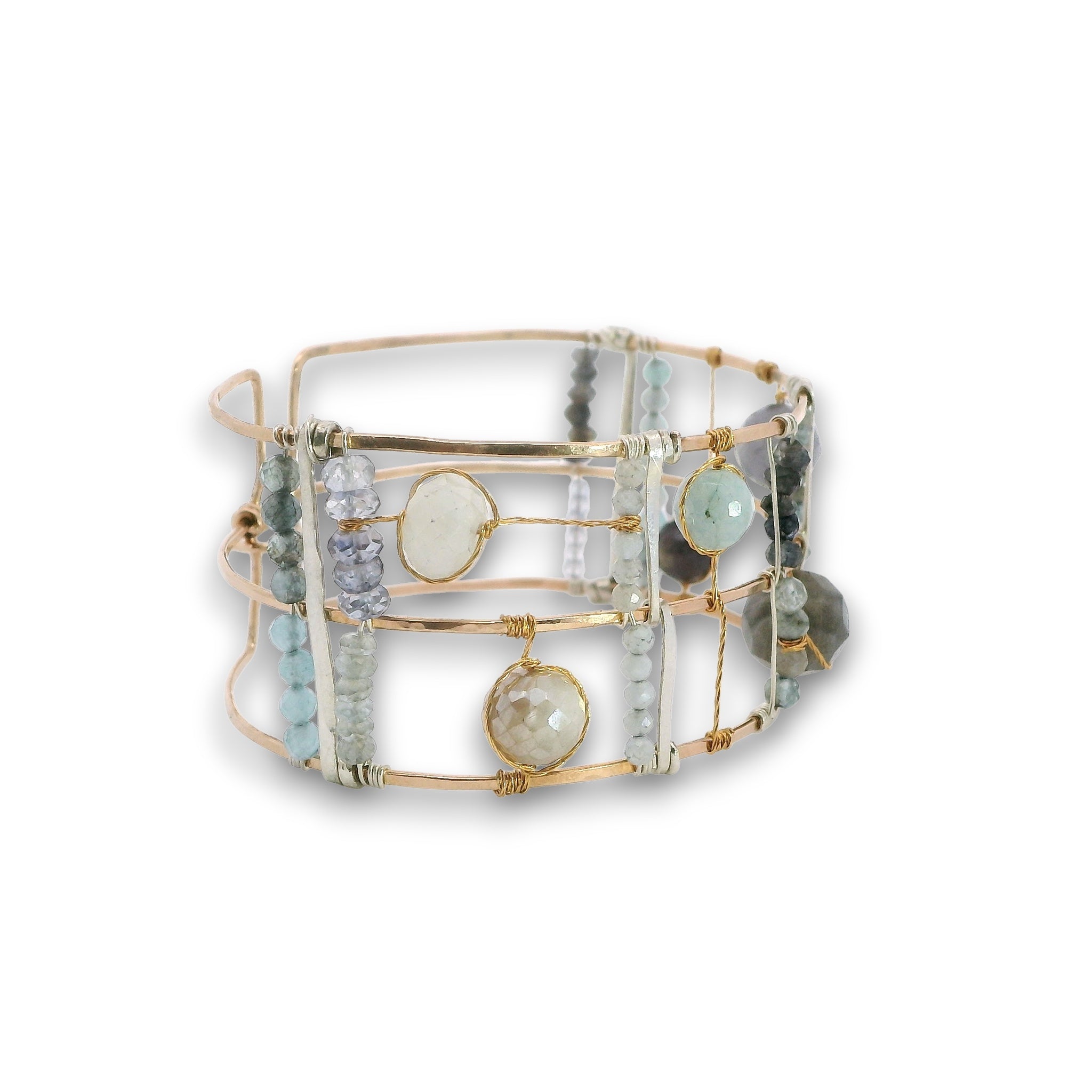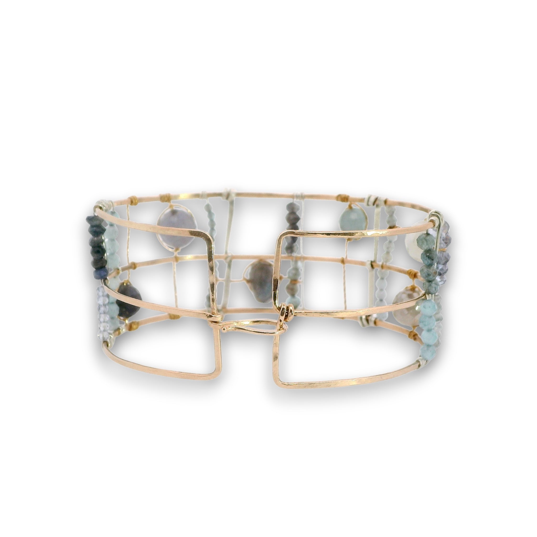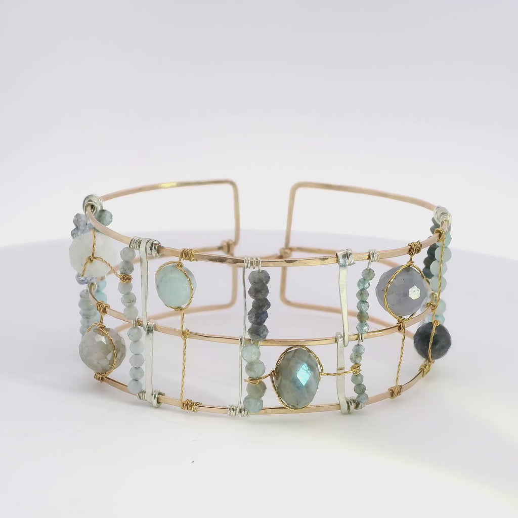 Wide bronze double cuff with sterling silver hammered bars decorated in a plaid pattern with aquamarine, moonstone, labradorite, apatite, and iolite gemstones