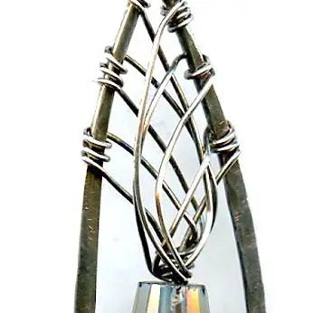 blue green crystal cone inside a brass chapel shaped earring woven with sterling silver fine wire