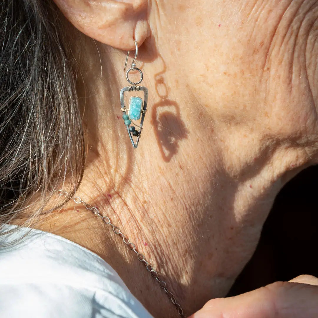 Oxidized sterling silver mini point earrings with aqua colored druzy quartz slices and blue tourmaline gemstones on gold filled wire