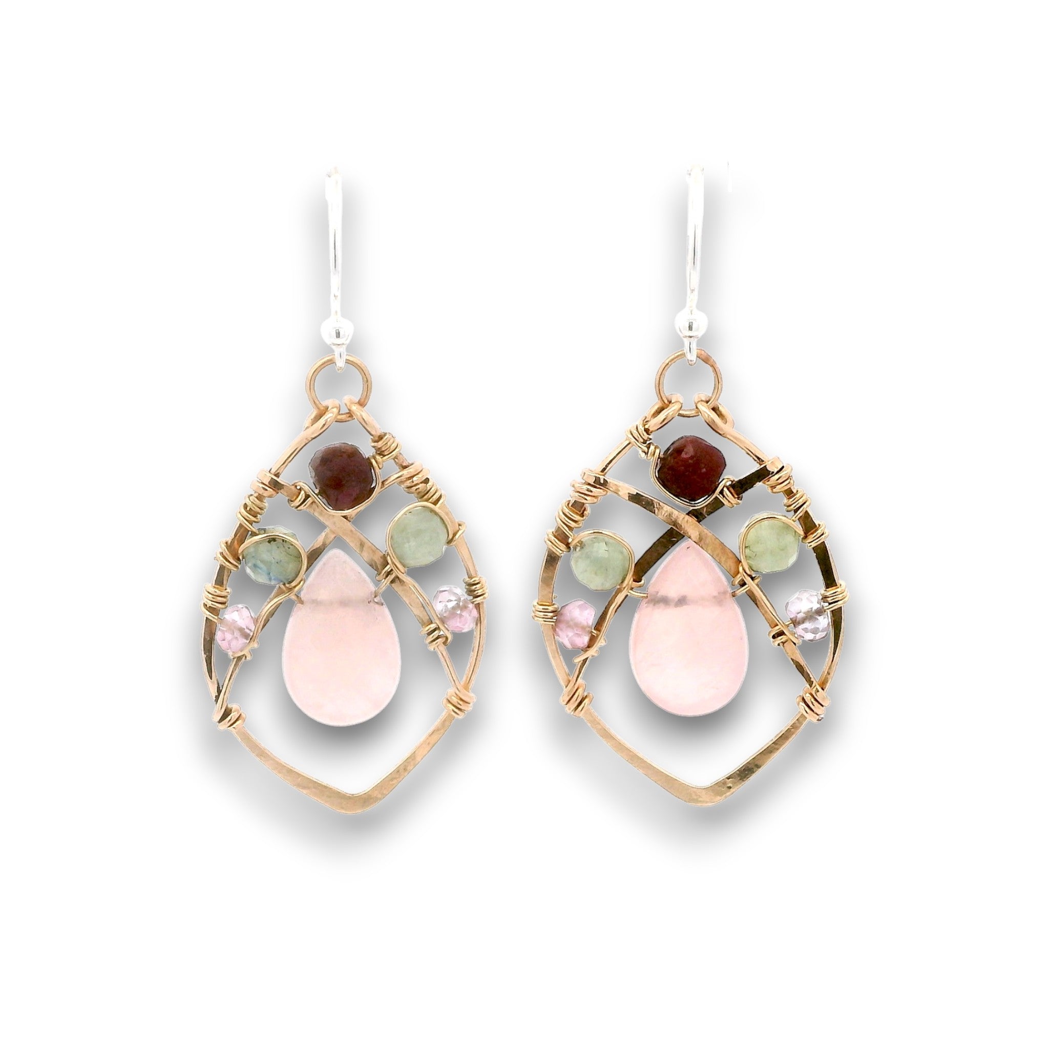 - Rose quartz drops, pink quartz, green kyanite, and garnet faceted gemstones