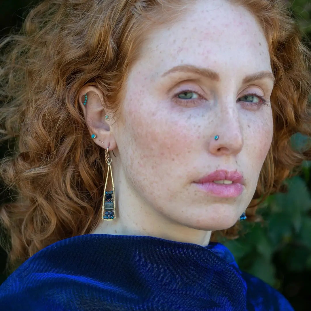 Lapis and onyx gemstones stacked with blue crystal on gold filled wire within a skinny, tall sterling silver triangle shaped earrings