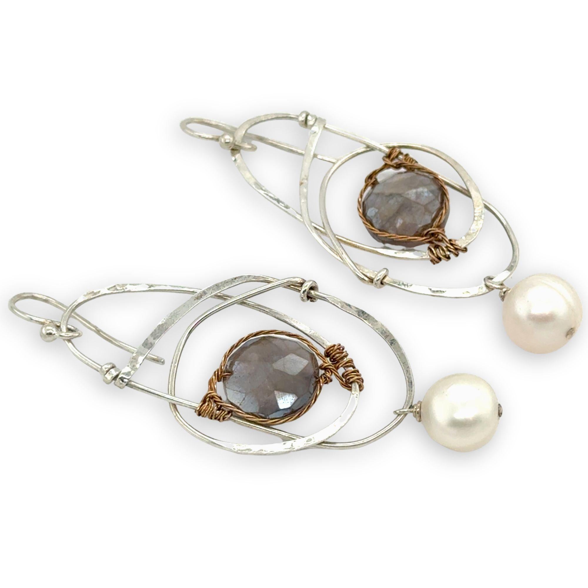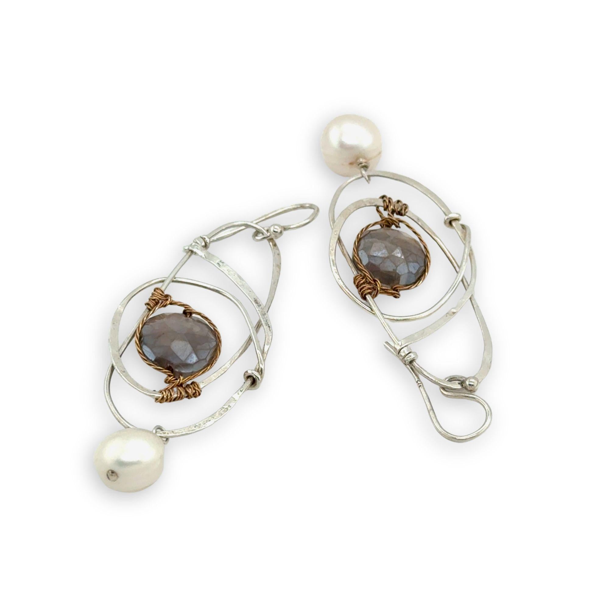 Mauve moonstone faceted coin gemstones are wrapped in brass twist wire attached to a sterling silver earring with a fresh water pearl dangle
