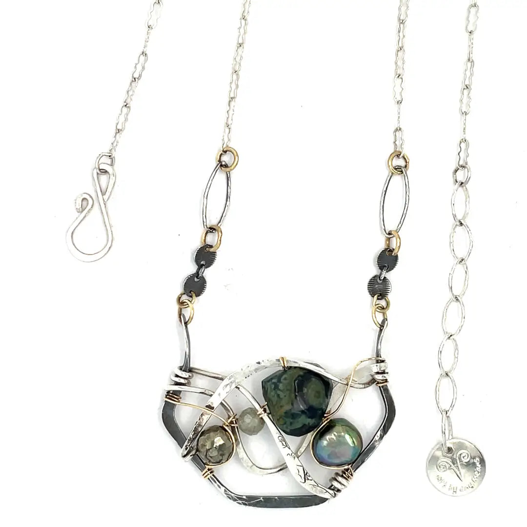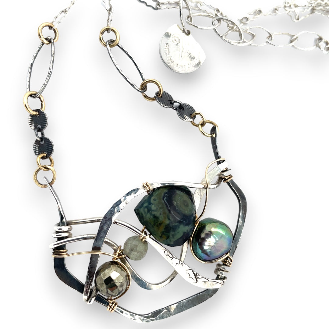 - Kambaba jasper, freshwater pearl, pyrite, and green kyanite faceted gemstones