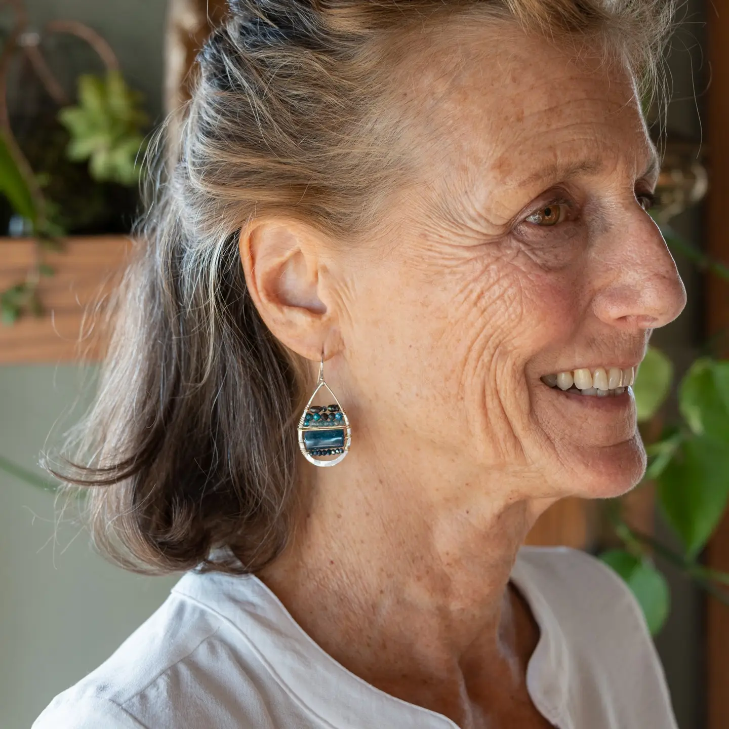 Sterling silver hammered drop earrings with smooth apatite tiles, chrysocolla, muted purple fresh water pearl, and crystal wrapped in gold filled wire