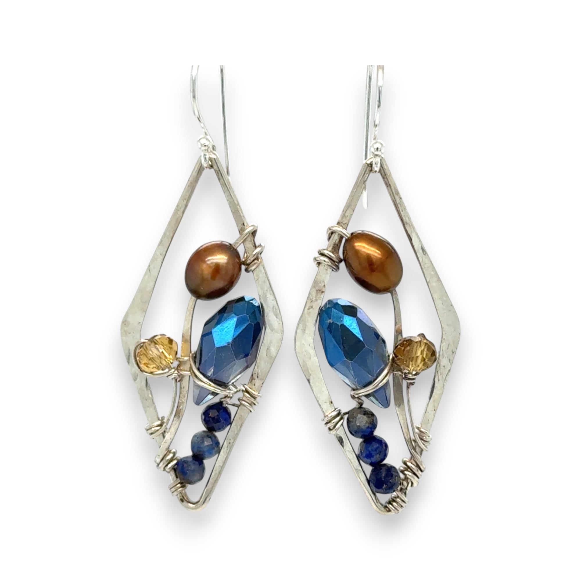 A pair of sterling silver mini diamond earrings featuring rust colored fresh water pearls, golden crystals, blue crystal drops, and lapis gemstones