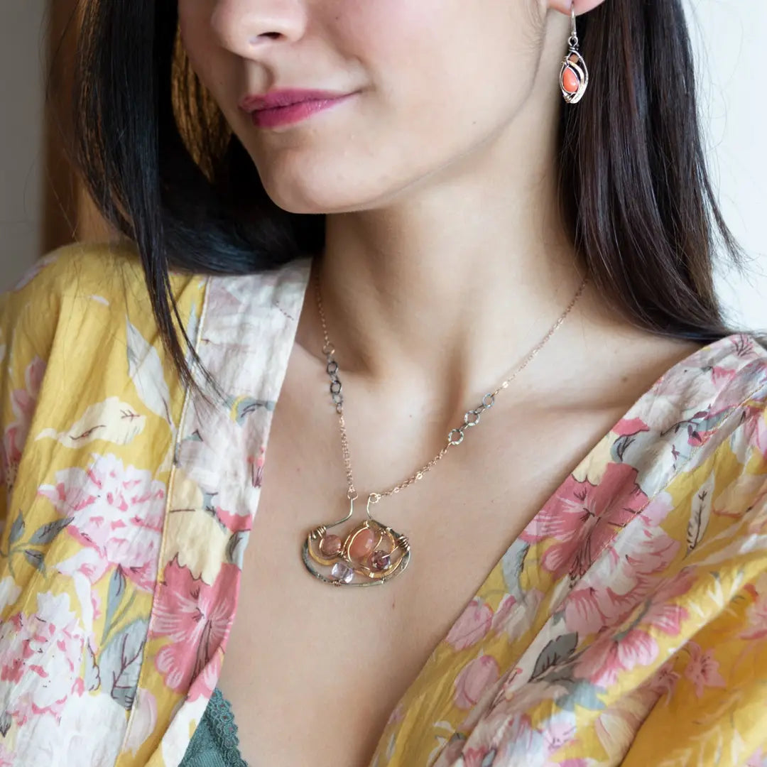 A darkened sterling silver pallete pendant necklace with bronze hammered swirls, featuring a series of faceted gemstones including amethyst and rhodocrosite, peach fresh water coin pearl, and crystal, complemented by a rose gold chain and a silver textured chain.