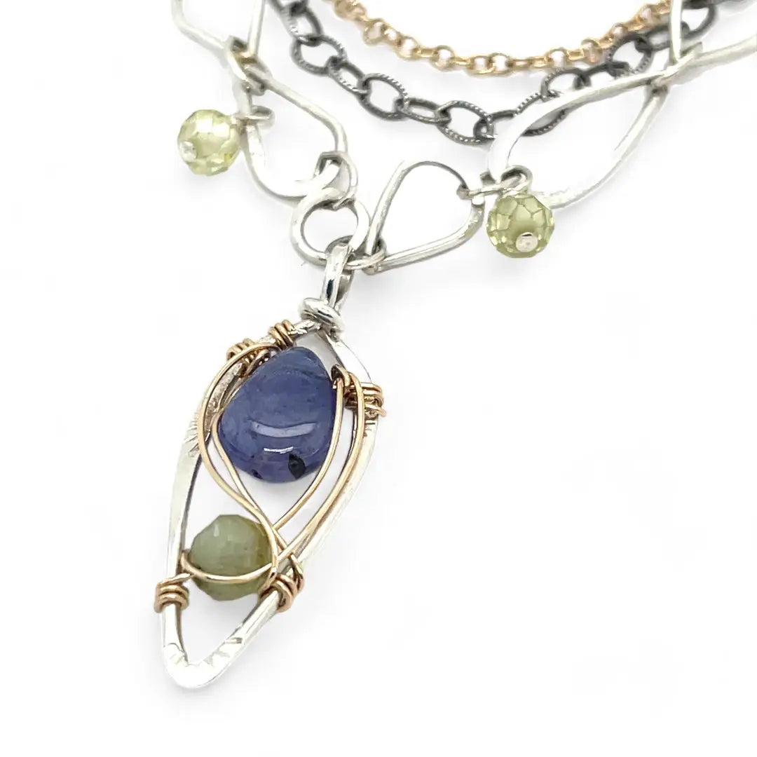 Sterling silver stamped mini drop necklace with smooth tanzanite drop and green kyanite gemstones on a triple strand gold filled. darkened sterling, and handmade sterling link chain