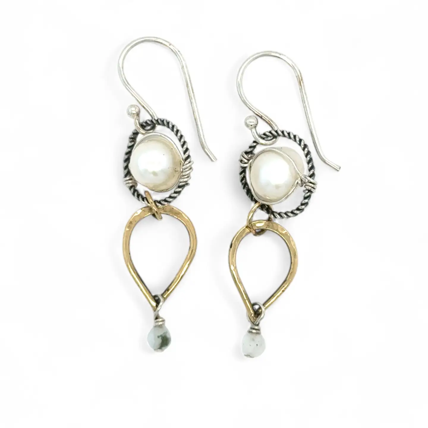 Handmade hammered brass drops and oxidized twisted sterling silver hoops