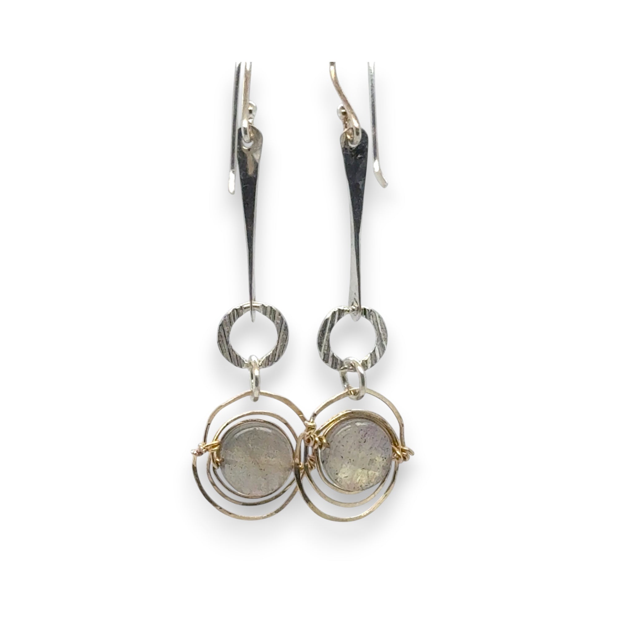 Flashy labradorite faceted coins wrapped in layers of gold filled wire hanging from a hand formed sterling silver twisted bar earring