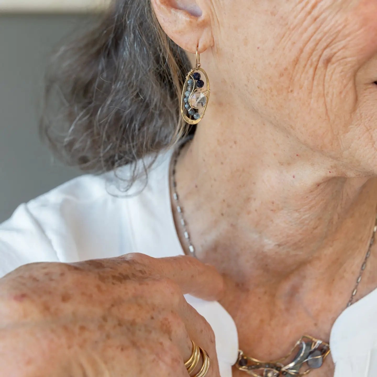 Art by Any Means jewelry is designed by Vanessa Savlen and completely handmade in our seaside studio. Graceful silhouettes of hand-formed hammered metals are set with individually selected gemstones to create light sculptural pieces that are as original as you. Art by Any Means earthy glam jewelry details are artisanal luxury with intention and style. Why wear accessories when you can wear art?