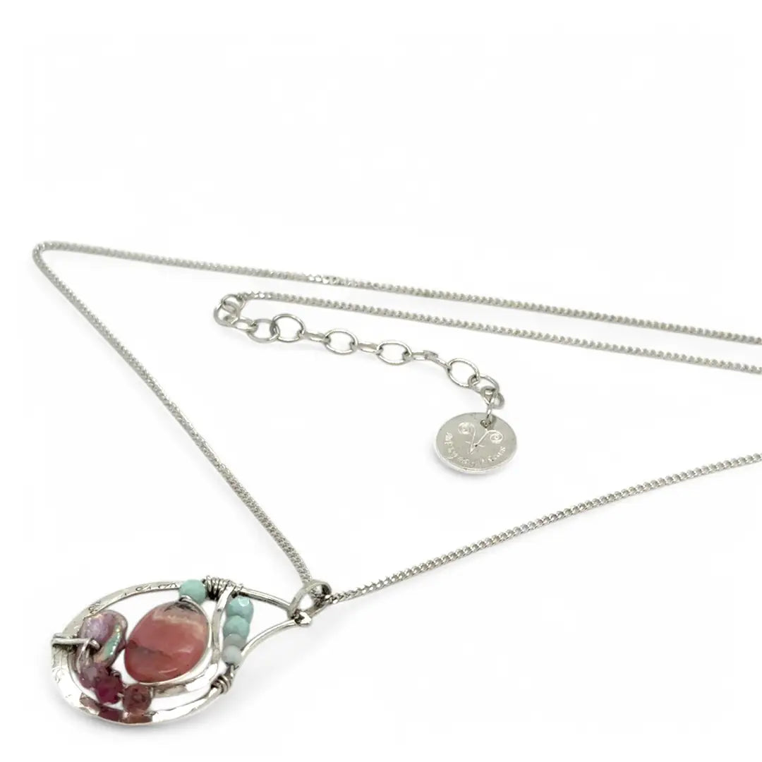 smooth rhodochrosite, pink fresh water pearl, pink tourmaline, moonstone, and larimar gemstones fill the inside of a floral stamped and hammered sterling silver necklace