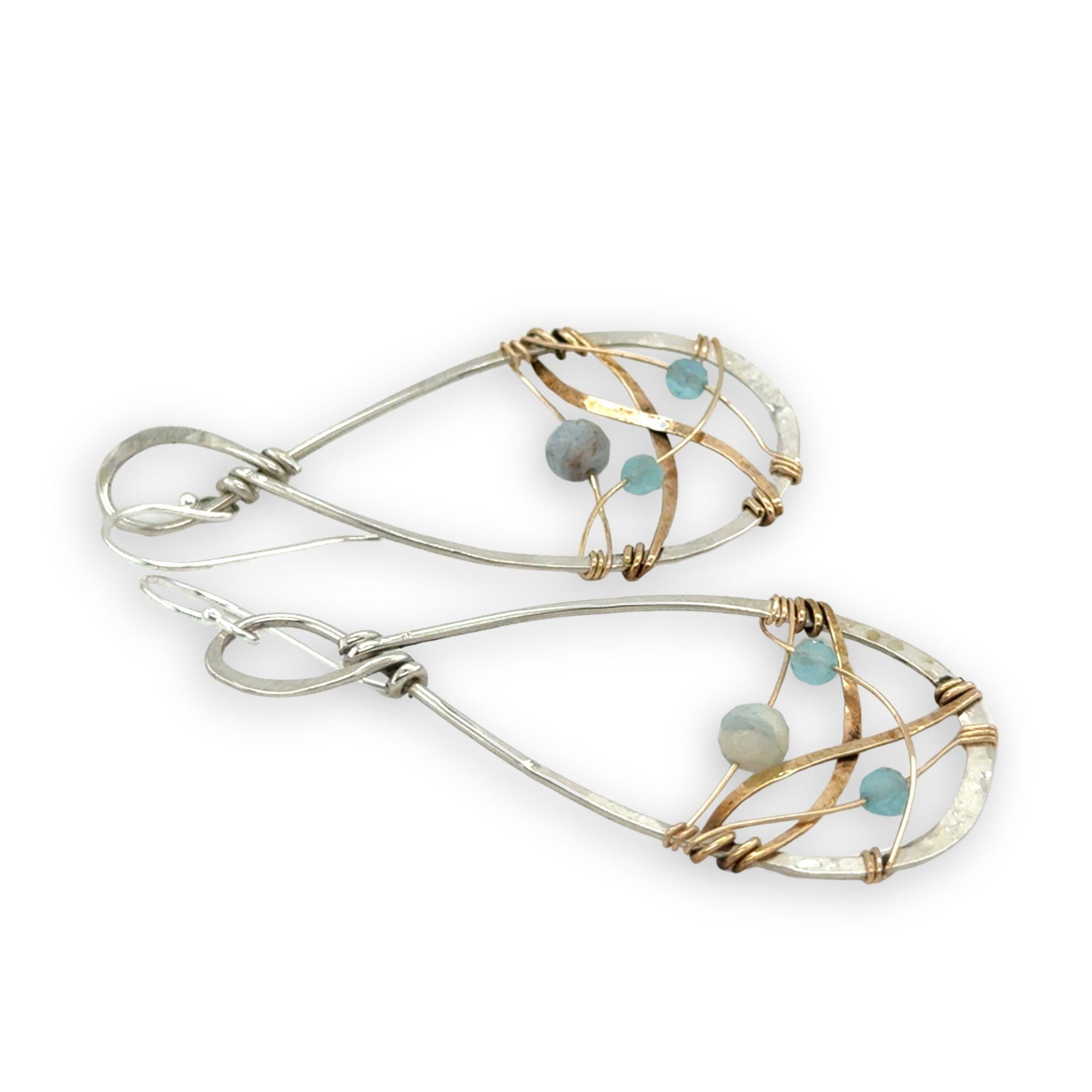 Aquamarine faceted gemstones weaved in gold filled wire along side brass hammered wire on a handmade sterling silver infinity shaped earrings