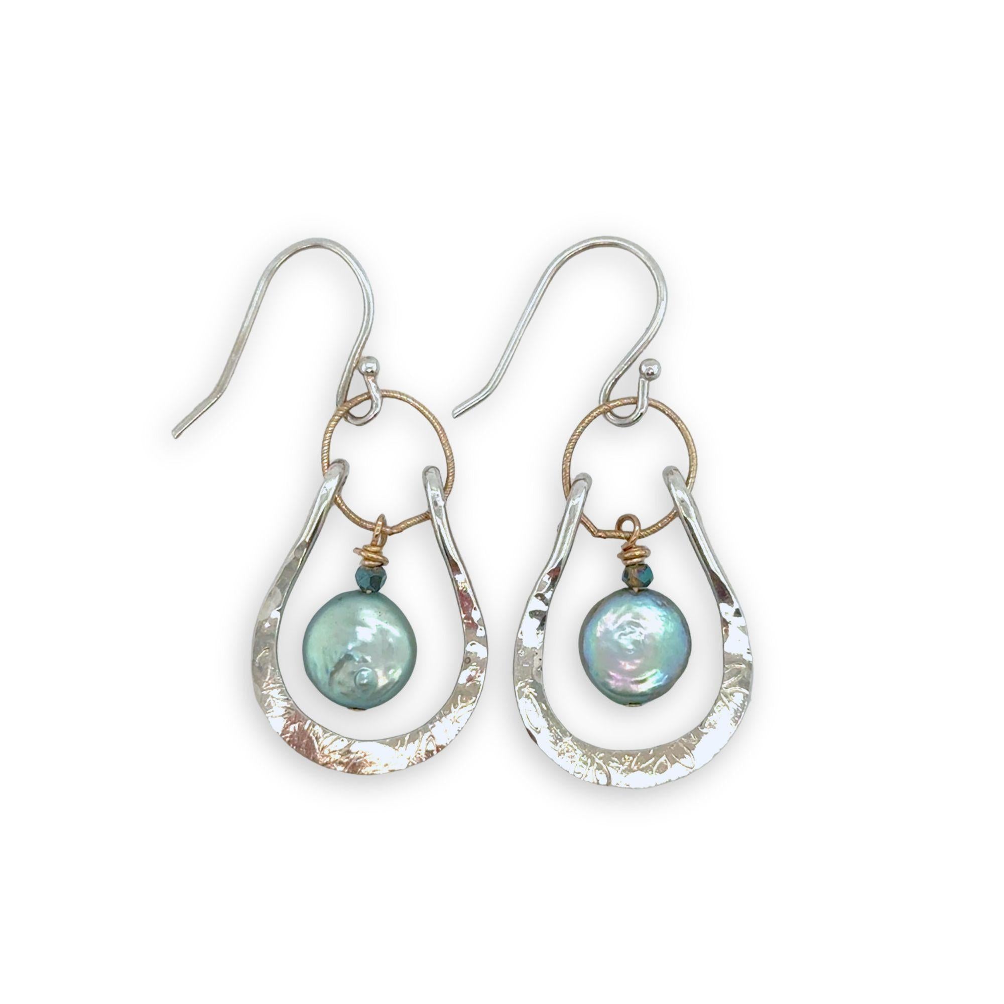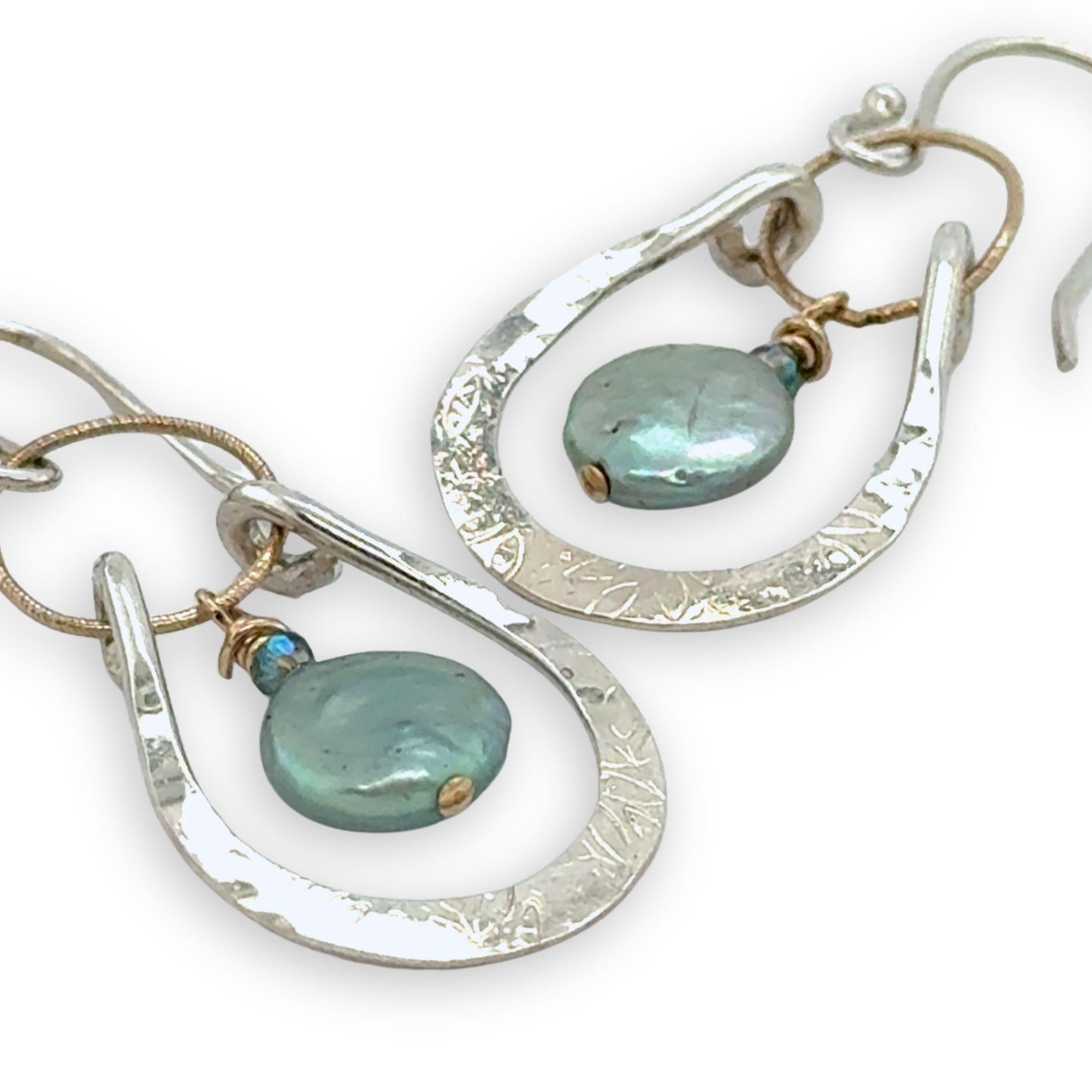 Mint fresh water pearl coin held within a stamped and hammered sterling silver open hoop hanging on a gold filled braided link