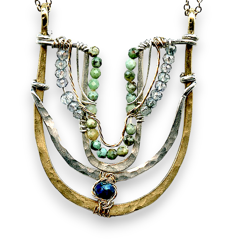 Art by Any Means jewelry is designed by Vanessa Savlen and completely handmade in our seaside studio. Graceful silhouettes of hand-formed hammered metals are set with individually selected gemstones to create light sculptural pieces that are as original as you. Art by Any Means earthy glam jewelry details are artisanal luxury with intention and style. Why wear accessories when you can wear art?
