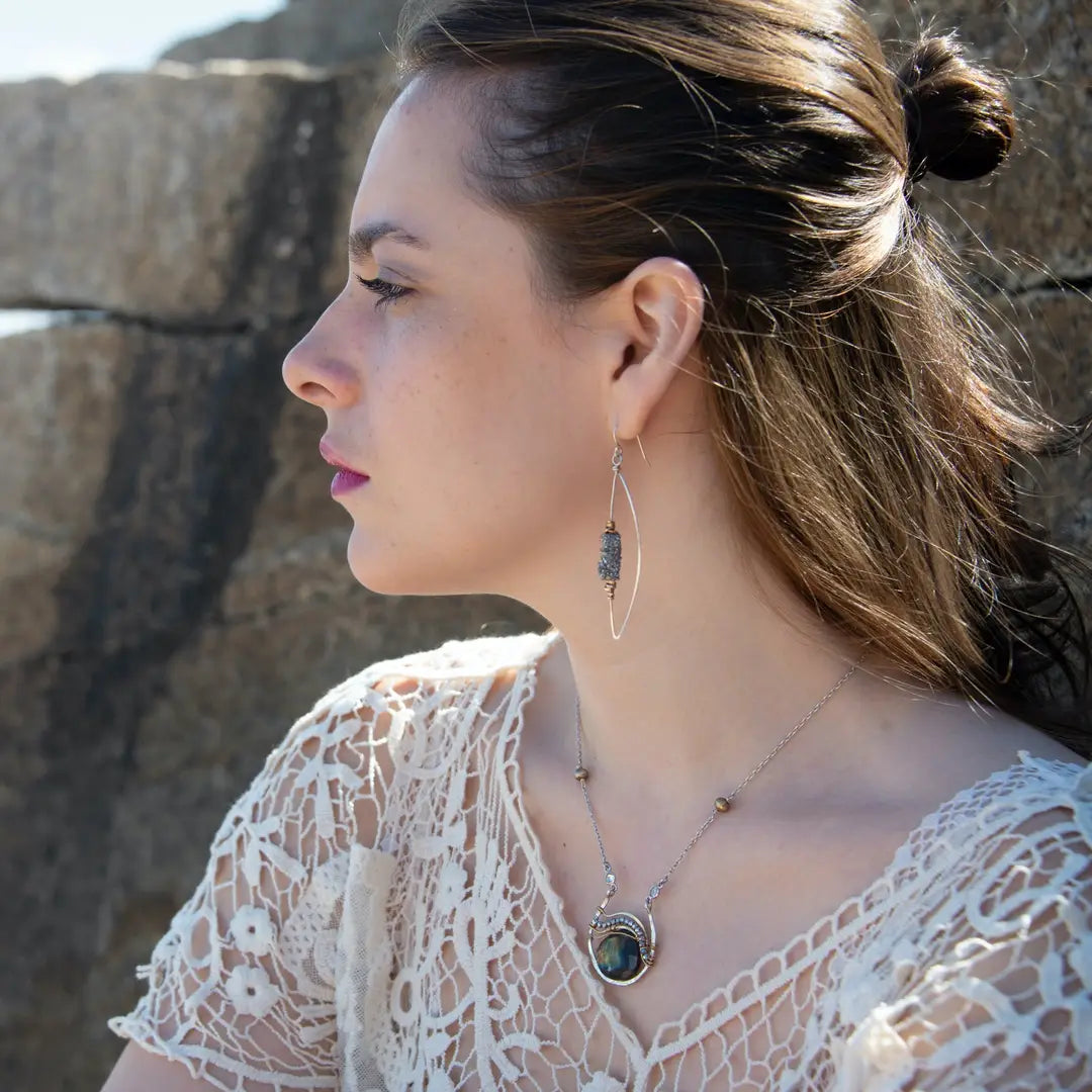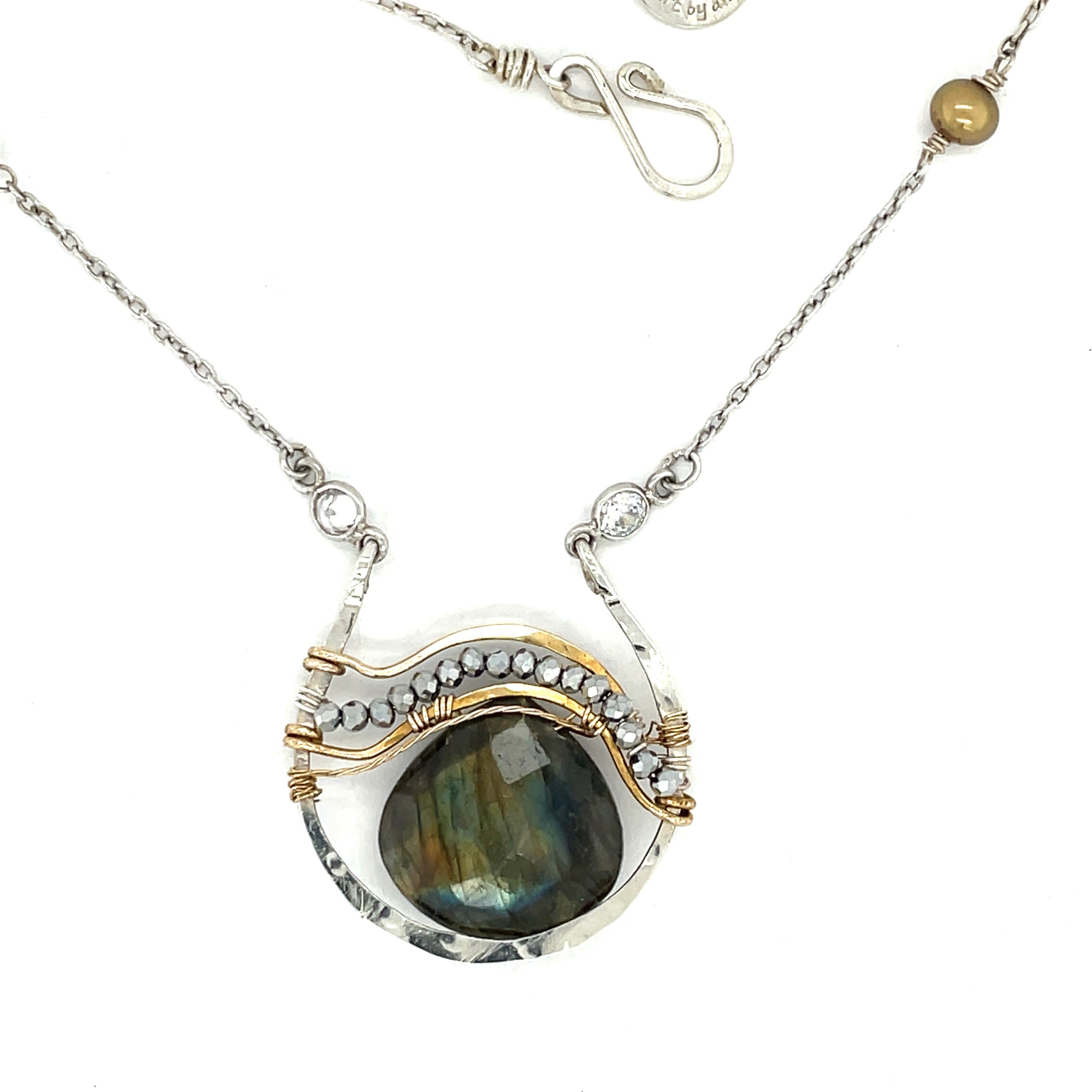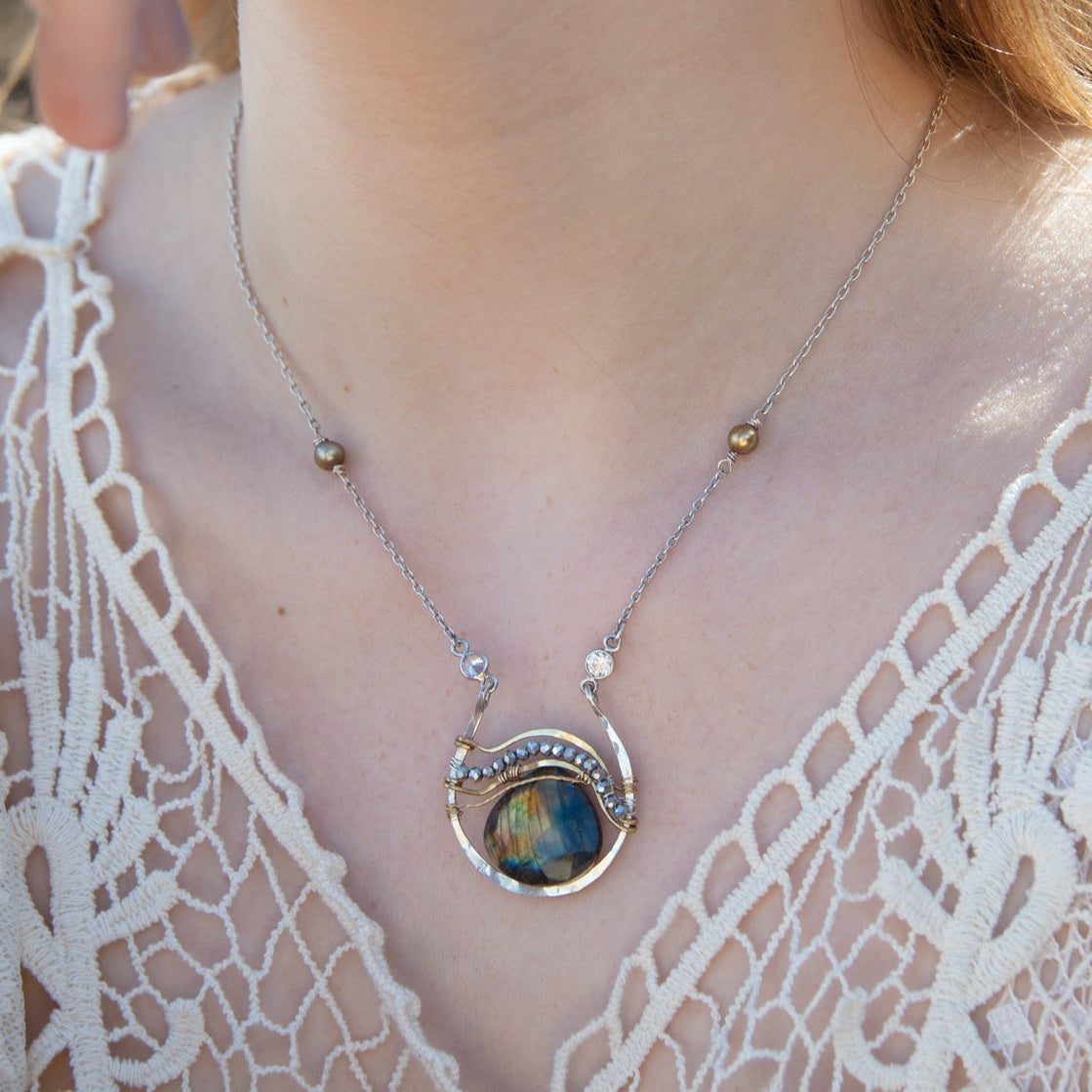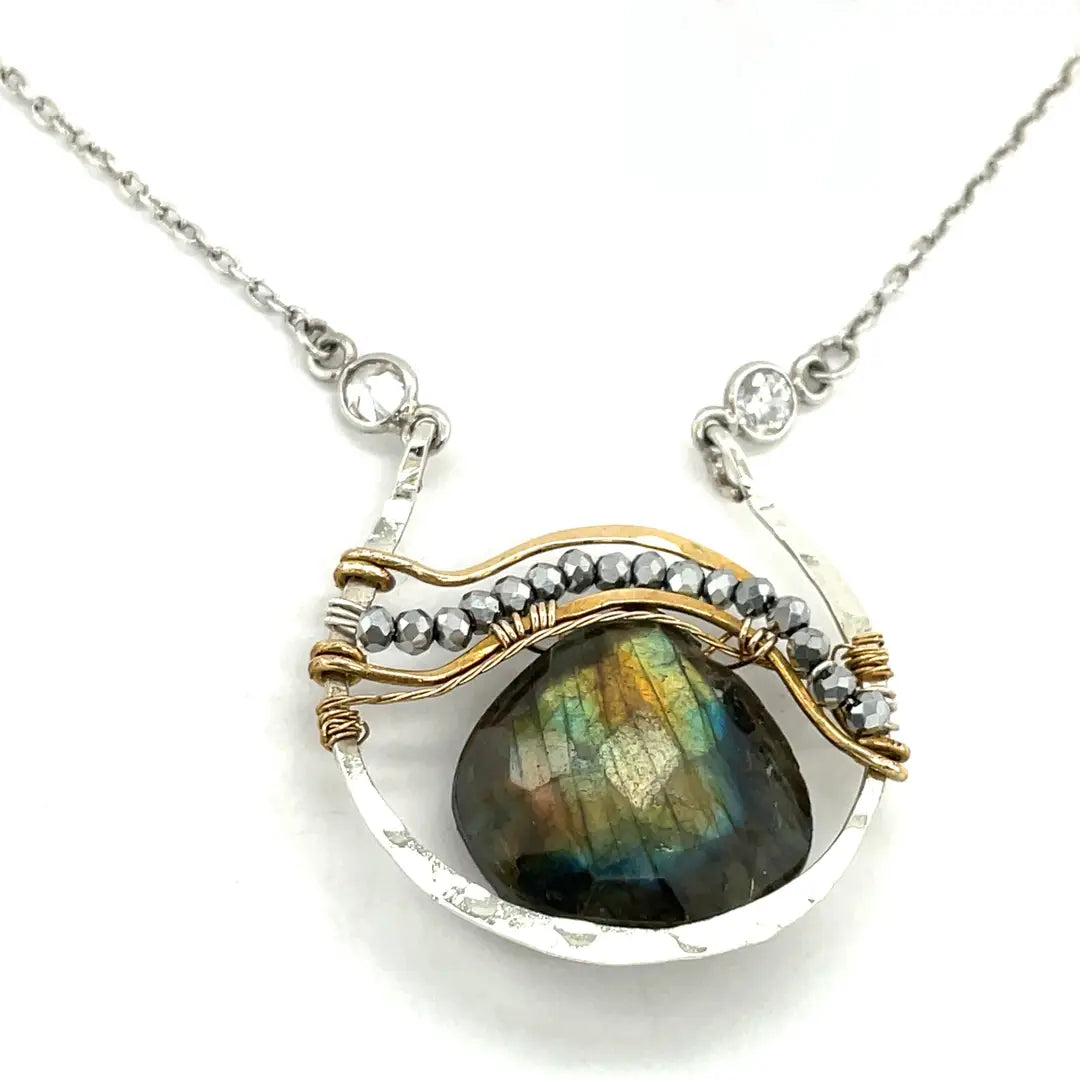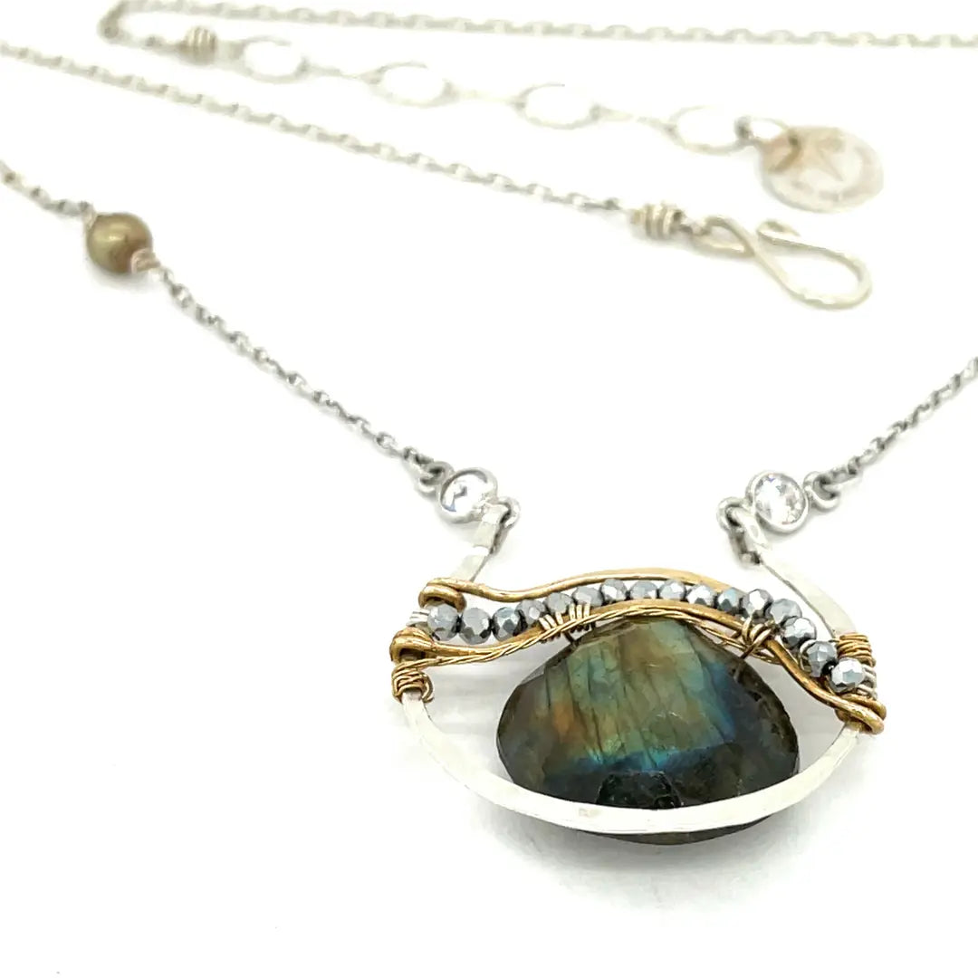 Labradorite gemstone drop nestled in hammered brass and twinkly crystal to a sterling silver hand formed pendant necklace.
