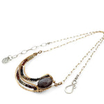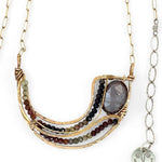 Satiny faceted mauve moonstone is lifted up in hand formed bronze waves edged in tourmaline micro faceted gemstones.