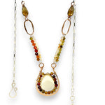 Grossular garnet and rutilated micro faceted ombre gemstones harmonize with a single smooth glowing bear quartz drop set in hammered bronze. The chain has two hammered handmade bronze links and faceted whiskey quartz gemstone drops.