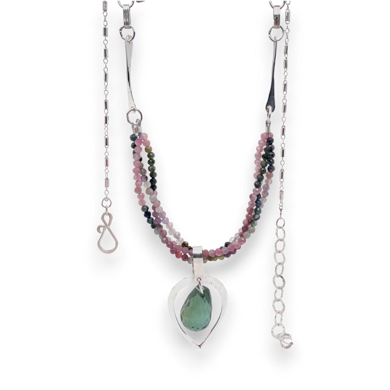 Triple strands of watermelon tourmaline micro faceted gemstones with a center green amethyst faceted gemstone inside a handmade drop pendant necklace.