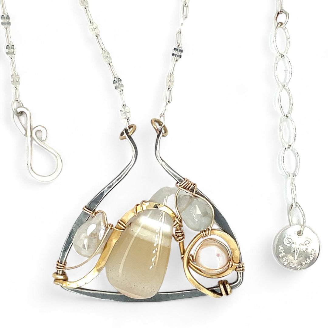 Art by Any Means jewelry is designed by Vanessa Savlen and completely handmade in our seaside studio. Graceful silhouettes of hand-formed hammered metals are set with individually selected gemstones to create light sculptural pieces that are as original as you. Art by Any Means earthy glam jewelry details are artisanal luxury with intention and style. Why wear accessories when you can wear art?