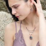 - Oxidized, textured sterling silver chain layered with bright sterling silver tube chain and gemstones