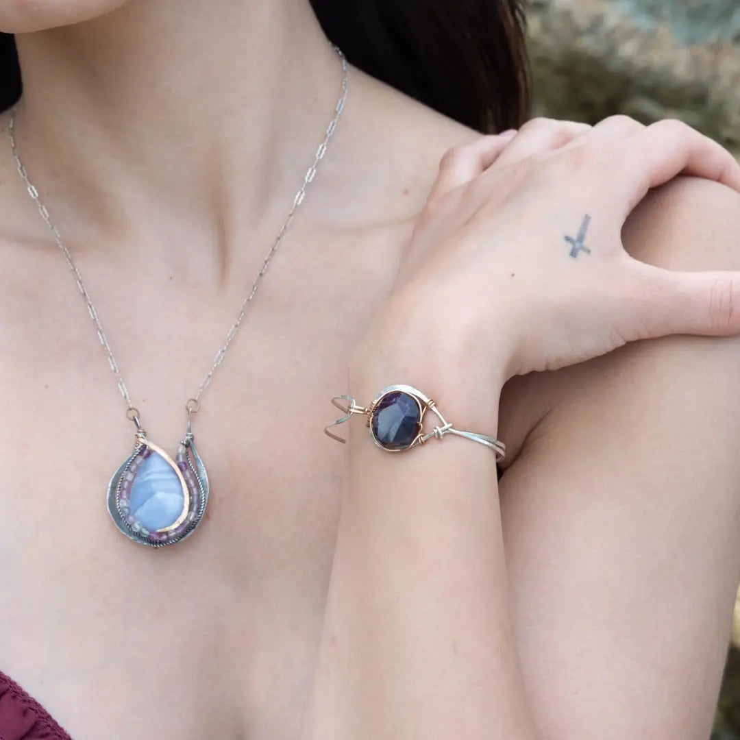 Art by Any Means jewelry is designed by Vanessa Savlen and completely handmade in our seaside studio. Graceful silhouettes of hand-formed hammered metals are set with individually selected gemstones to create light sculptural pieces that are as original as you. Art by Any Means earthy glam jewelry details are artisanal luxury with intention and style. Why wear accessories when you can wear art?