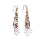 Webs of wire woven around a collection of stones with a waterfall of cascading rose quartz drops.