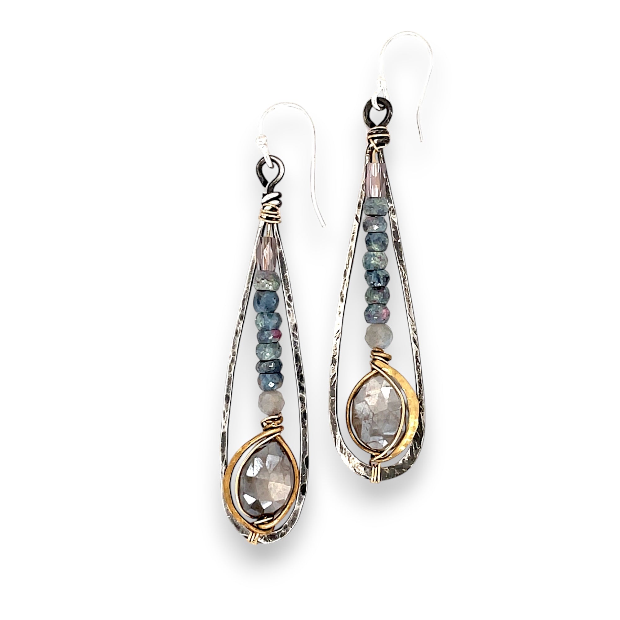 Blue ruby zoisite facetted gemstones culminate in a shimmering moon stone drop set in hammered brass within a patinated sterling silver hand formed drop earrings.