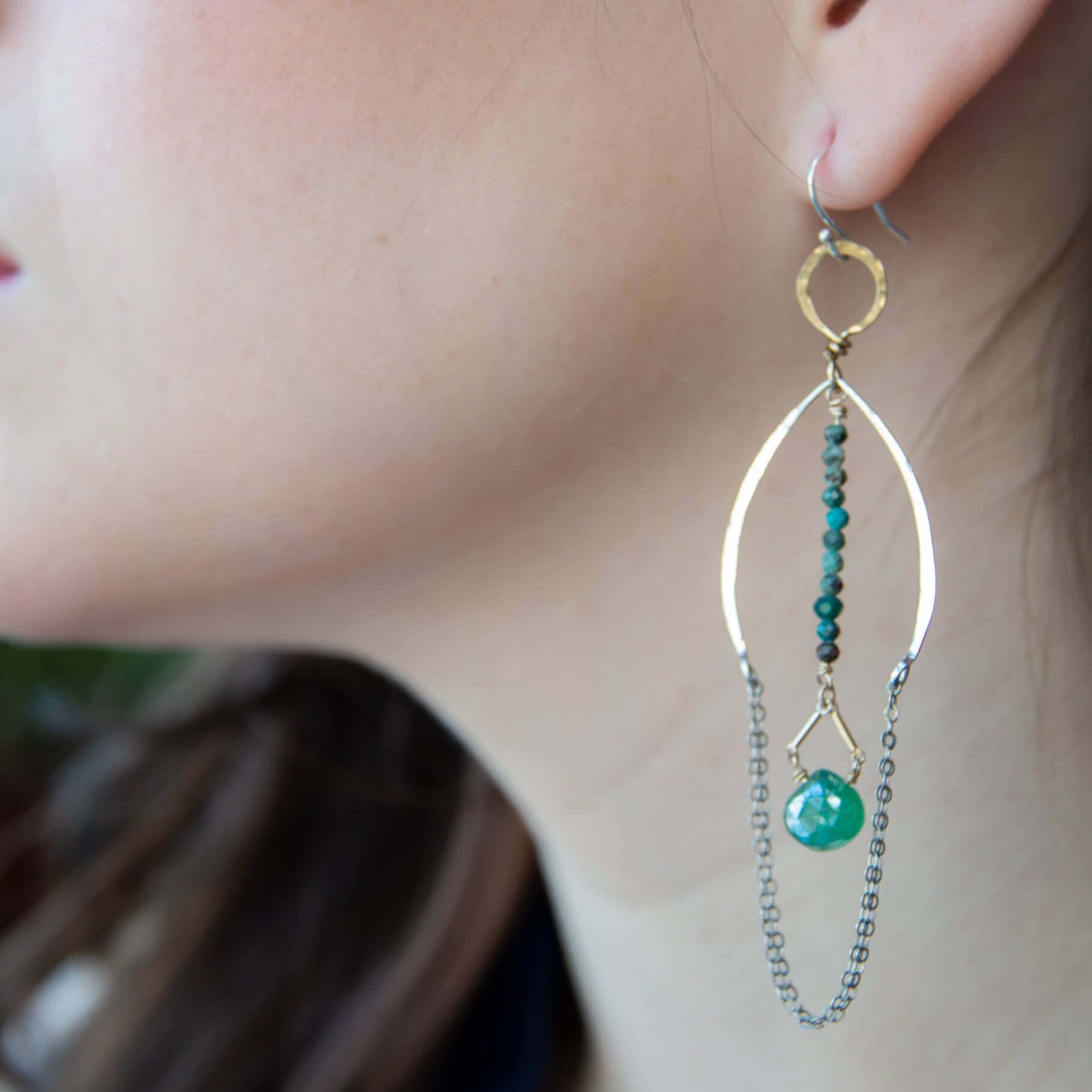 Chrysocolla micro faceted gemstones swing an onyx luster drop within hand formed brass and sterling silver chain earrings.