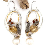 Citrine, labradorite, hessonite faceted gemstones gather in hammered brass and hand formed sterling silver earrings with natural fresh water pearl drops.