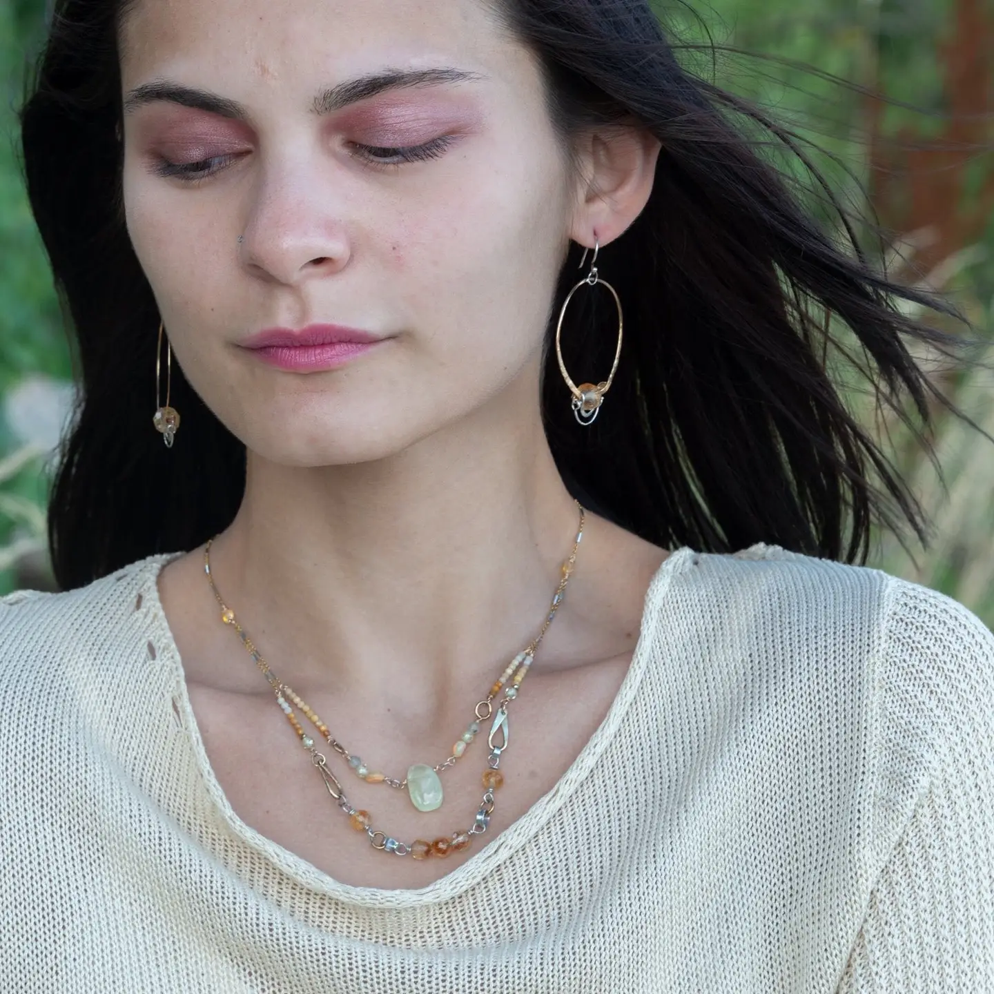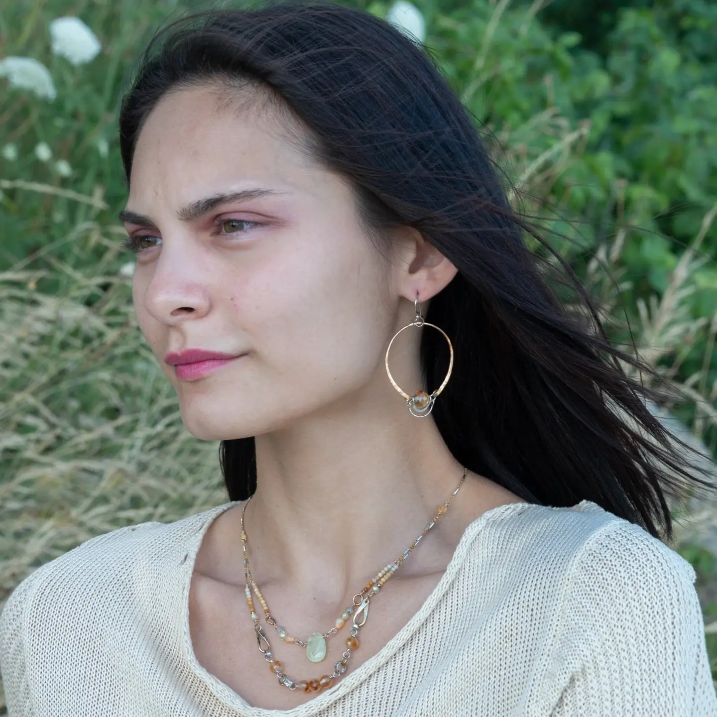 Art by Any Means jewelry is designed by Vanessa Savlen and completely handmade in our seaside studio. Graceful silhouettes of hand-formed hammered metals are set with individually selected gemstones to create light sculptural pieces that are as original as you. Art by Any Means earthy glam jewelry details are artisanal luxury with intention and style. Why wear accessories when you can wear art?