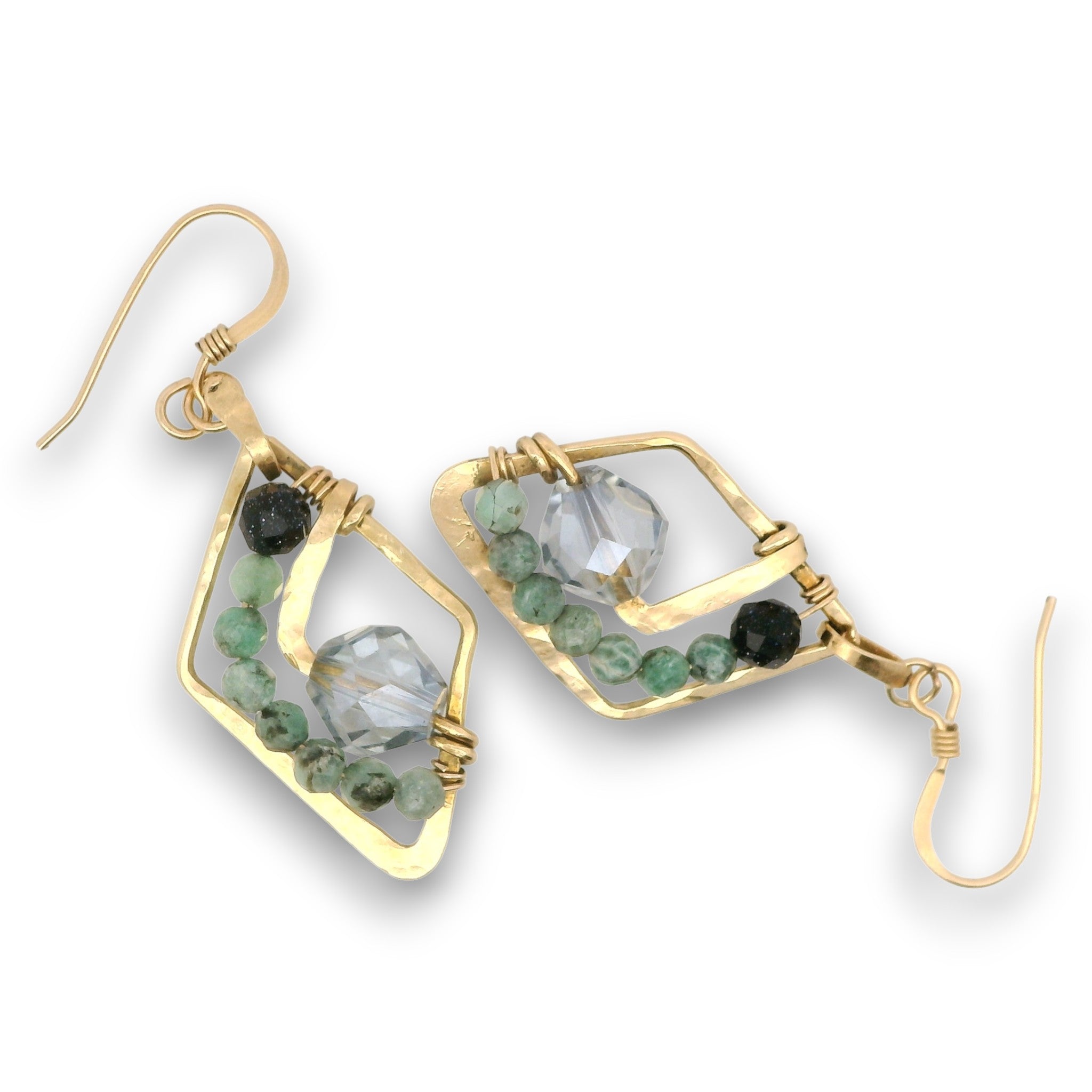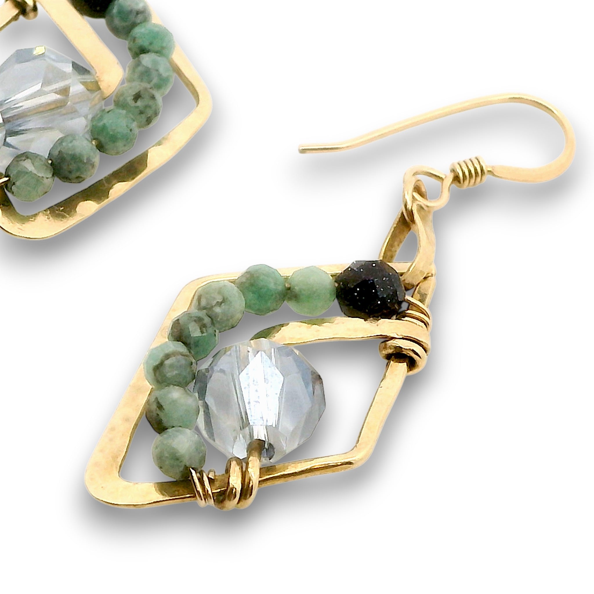 - Emerald, crystal, and blue goldstone faceted gemstones