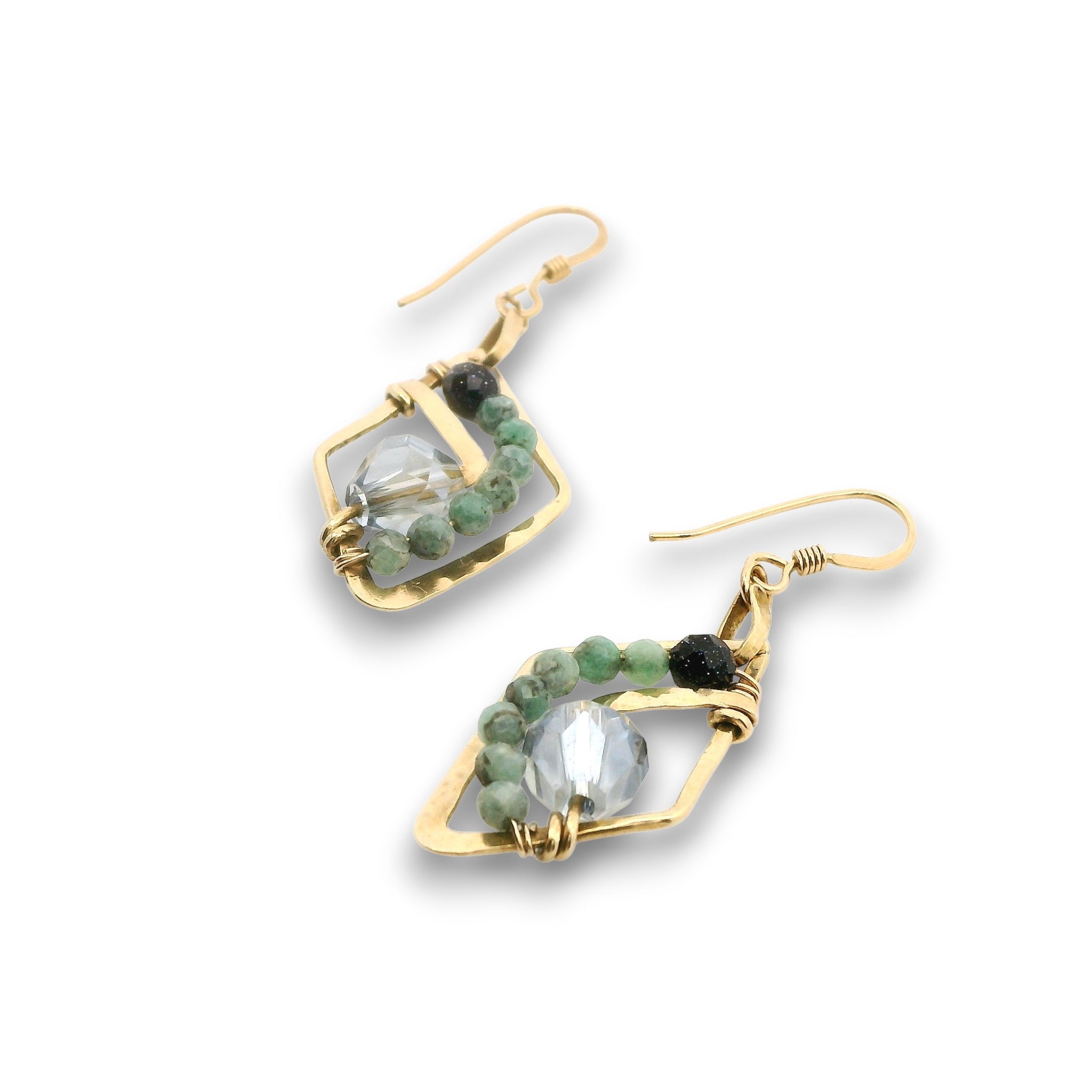 Do not store in direct sunlight. Salt water or chlorine will tarnish the metal. Use brass cleaner or silver polish on the metal. Wash gemstones with water and mild soap. Dry with a soft cloth if jewelry gets wet.